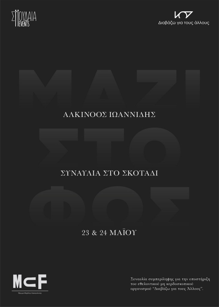 Ιnfo: Δευτέρα 28 & Τρίτη 29 Μαρτίου 2022/ώρα: 21.00/Ίδρυμα Μιχάλης Κακογιάννης/Τιμή εισιτηρίου: 15€/Προπώληση εισιτηρίων: https://www.ticketservices.gr/event/alkinoos-ioannidis-mazi-sto-fos/ Ταμεία Ιδρύματος Μ. Κακογιάννη/Ticket Services εκδοτήριο: Πανεπιστημίου 39, Στοά Πεσμαζόγλου/Και τηλεφωνικά: 2107234567
