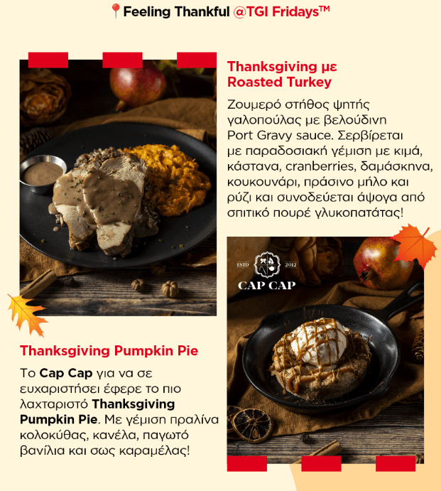 Στην Ελλάδα γενικά δεν το γιορτάζουμε τόσο (ακόμα τουλάχιστον), αλλά κάποιες χρονιές έχω παρατηρήσει διάφορα εστιατόρια να βγάζουν ειδικό μενού λόγω της ημέρας, πχ το Hard Rock Café. Σταθερή αξία στην γιορτή αυτή αποτελεί το αγαπημένο Friday’s που όπως κάθε χρόνο γιορτάζει την Ημέρα των Ευχαριστιών και θα είμαι κι εγώ εκεί να δοκιμάσω Roasted Turkey και λαχταριστό Thanksgiving Pumpkin Pie!